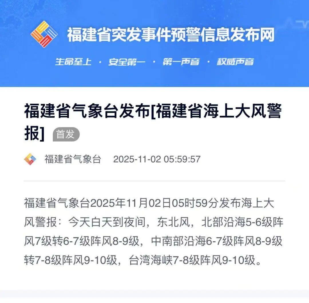 福建省气象台11月02日05时59分发布海上大风警报:今天白天到夜间,东北风,北部沿海5~6级阵风7级转6~7级阵风8~9级,中南部沿海6~7级阵风8~9级转7~8级阵风9~10级,台湾海峡7~8级阵风9~10级。