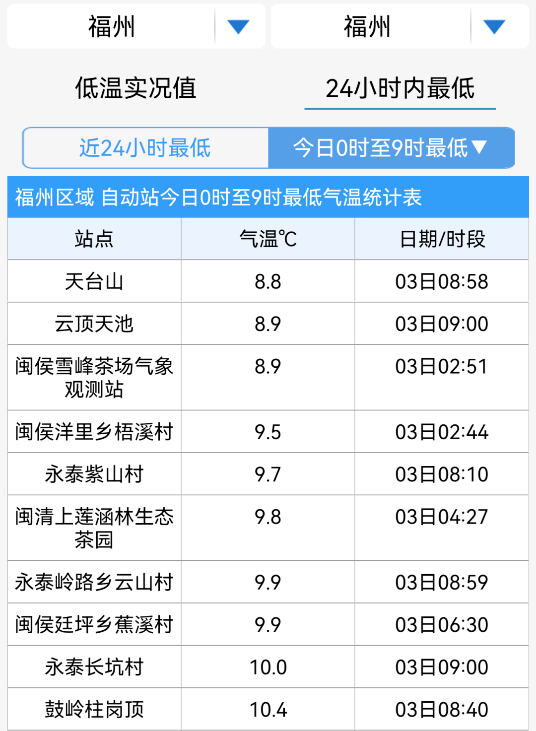 今晨,福州多地最低气温已经跌破10℃。其中,天台山最低气温只有8.8℃。