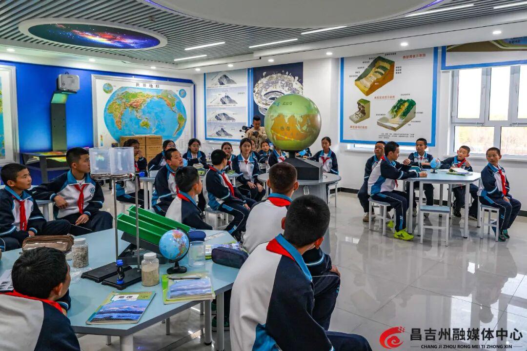 七年级的米娜·艾尔肯正和同学们在智慧黑板前上课。“以前只在电视上见过这样的教室,”这位来自牧区的女孩眼睛闪闪发亮地说,“现在老师一点屏幕,山川河流仿佛在眼前,还能看动画片学习英语,感觉梦想成真了!”
