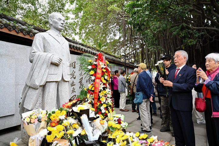11月6日,在福州市螺洲镇的吴石故居,人们向吴石雕像敬献鲜花表达敬意。