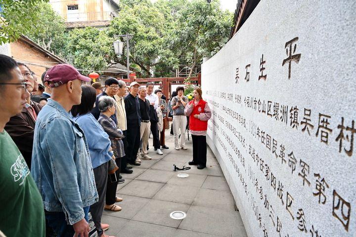 11月6日,在福州市螺洲镇的吴石故居,志愿者(右一)向人们介绍吴石生平。