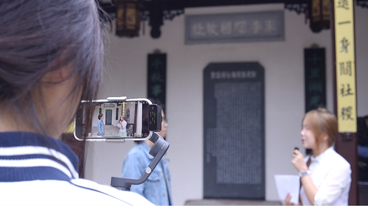 学生在西湖盆景园直播。丁心怡 摄