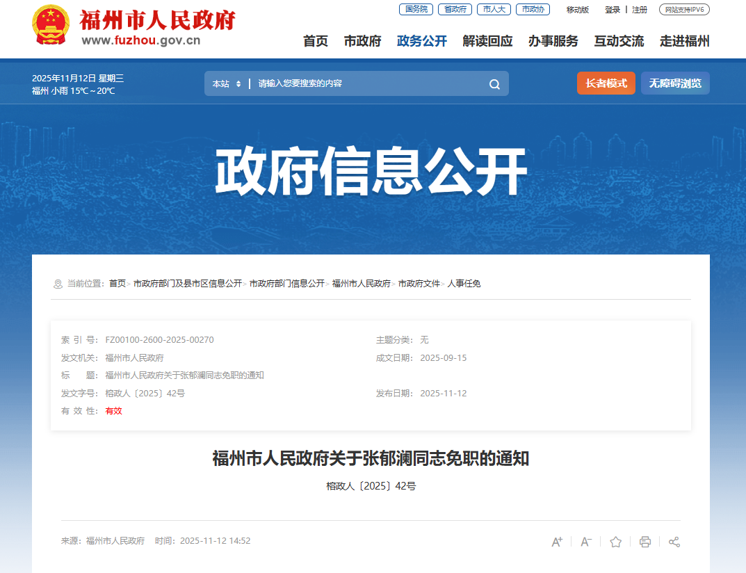 近日,福州市人民政府网站发布一批人事任免通知,一起来看——