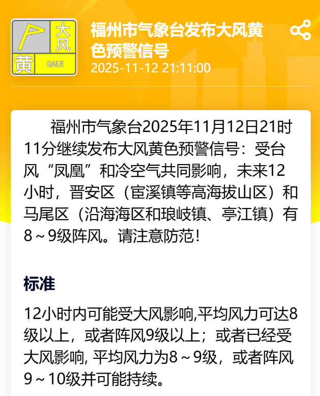 受台风和冷空气的共同影响,未来12小时晋安区(宦溪镇等高海拔山区)、马尾区(沿海海区和亭江镇、琅岐镇)有8级~9级大风。请注意防范!