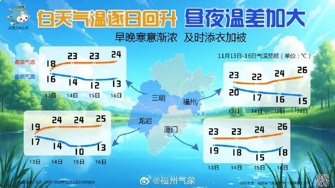需要留意的是,受冷空气影响,未来三天夜晨气温将逐日走低,14日夜晨,中北部大部地区最低气温集体降至15℃以下,山区更低,甚至会跌破10℃,有了初冬的寒意,早晚要及时添衣加被,谨防感冒。