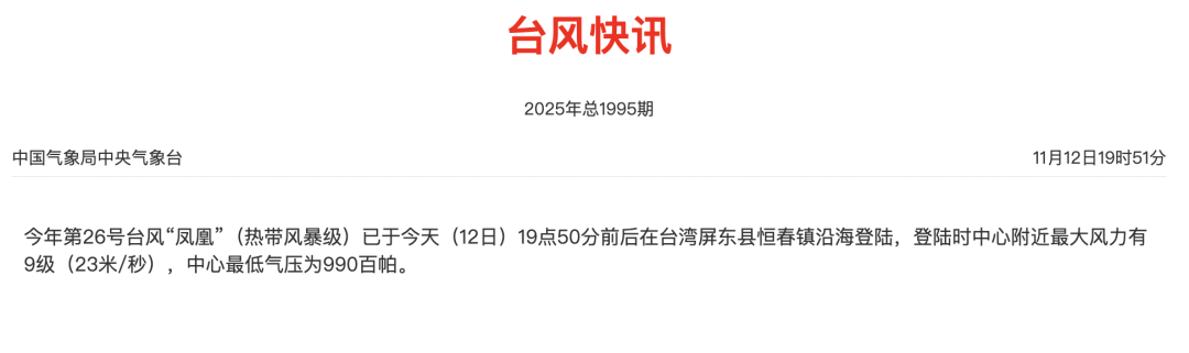 今年第26号台风“凤凰”(热带风暴级)已于今天(12日)19点50分前后在台湾屏东县恒春镇沿海登陆,登陆时中心附近最大风力有9级(23米/秒),中心最低气压为990百帕。