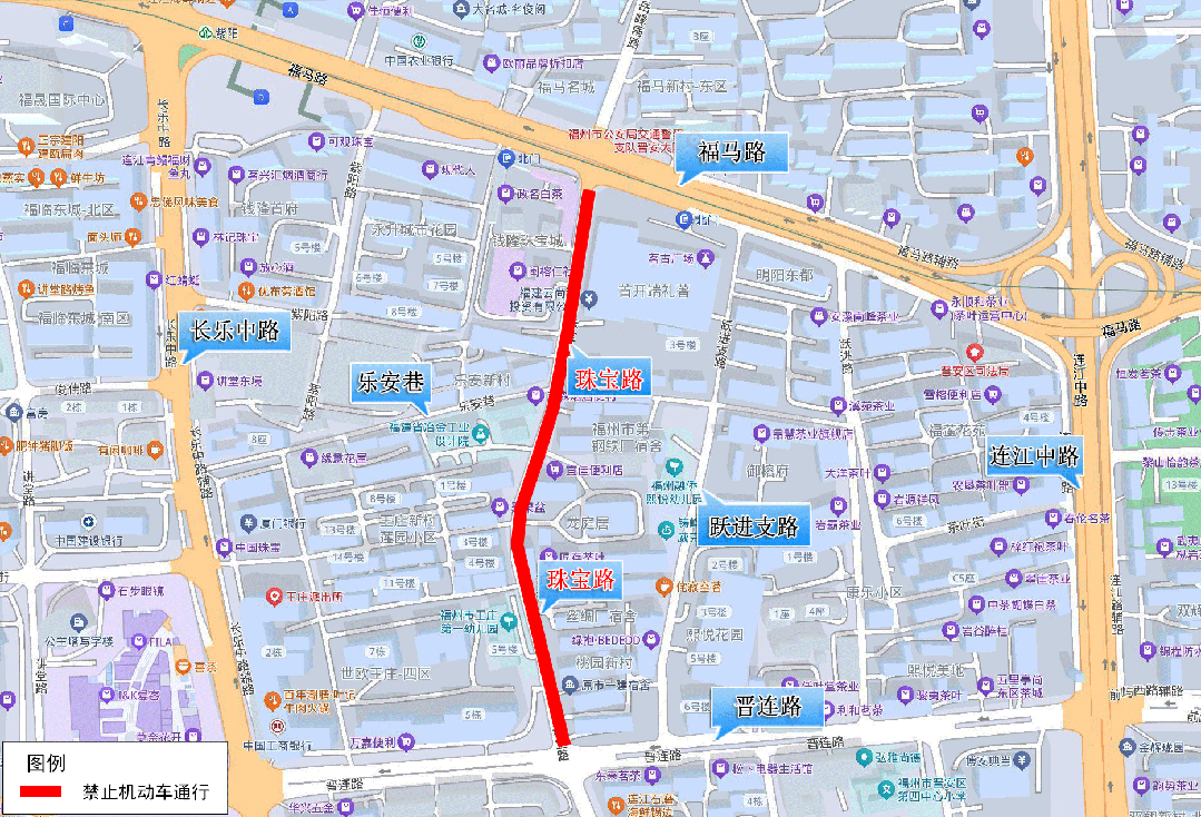 一、从2025年11月17日至施工结束(工期约2个月),根据施工进展,视情对珠宝路(南起晋连路口,北至福马路口)实行临时交通管制,禁止机动车通行。