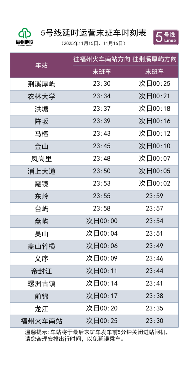 11月15日、16日,2号线、5号线运营服务时间将延长30分钟,末班车始发时间延至23:30。