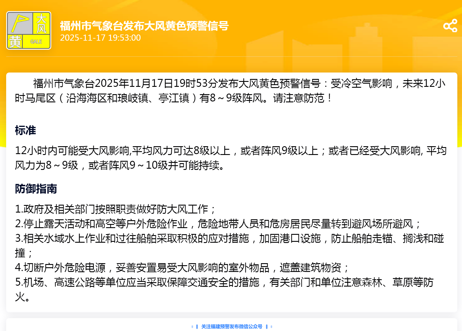 福州市气象台2025年11月17日19时53分发布大风黄色预警信号:受冷空气影响,未来12小时马尾区(沿海海区和琅岐镇、亭江镇)有8~9级阵风。请注意防范!