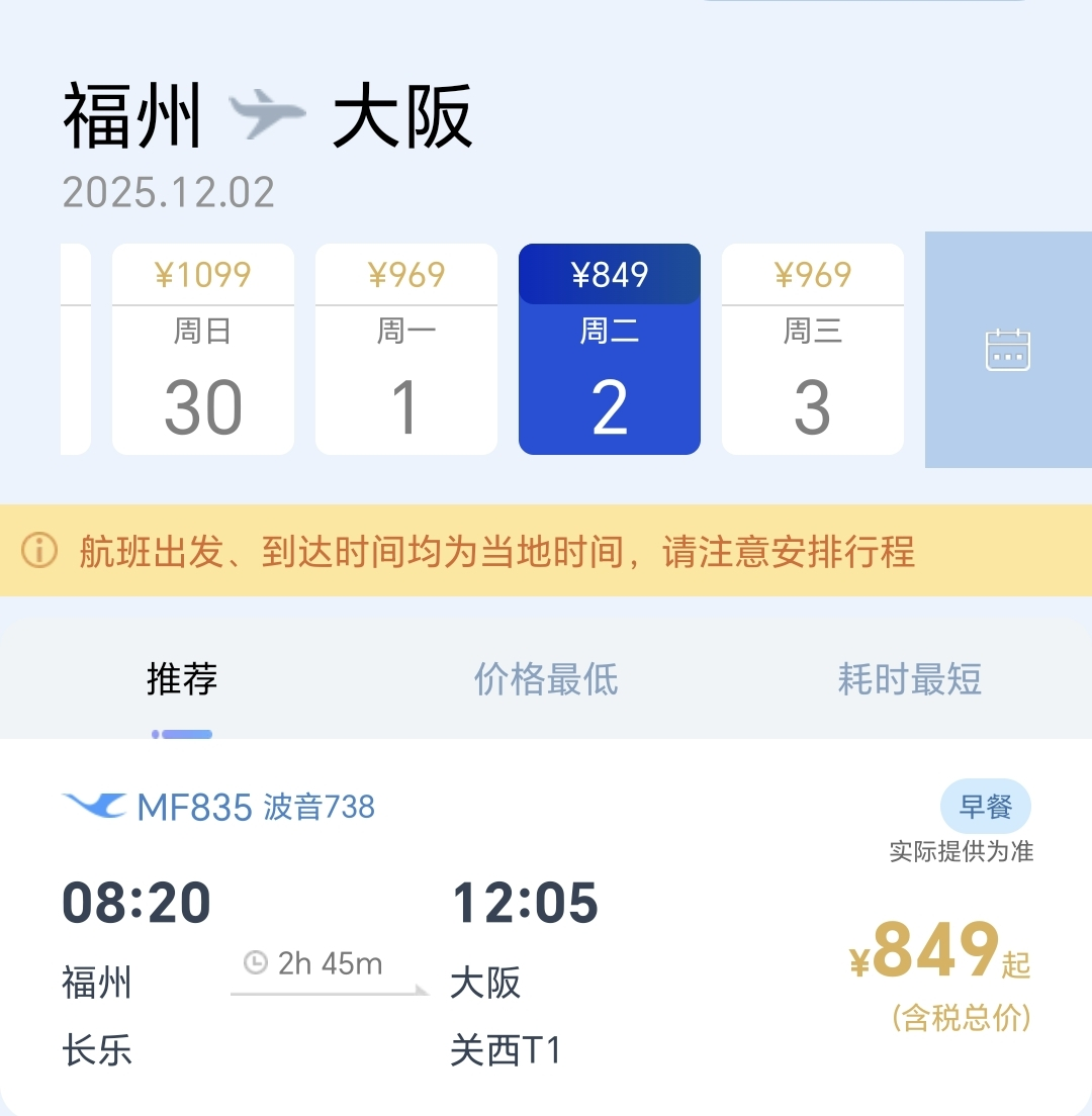 而在价格方面,记者发现,目前福州与日本城市之间往返机票价格也出现明显下降。根据平台数据,福州前往日本东京、大阪的机票目前正常开售,飞往东京的价格在12月降至1299元左右,而飞往大阪的价格更低,单程下降至849元。尽管如此,航司的信息显示,航班预订率仍然持续下滑。