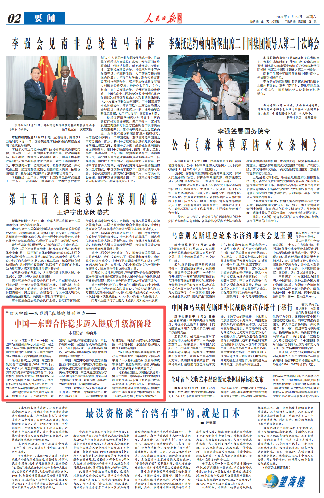 11月22日,人民日报海外版要闻二版刊发报道《“2025中国—东盟周”在福建福州举办——中国—东盟合作稳步迈入提质升级新阶段》。11月17日至19日在福建福州举办的“2025中国—东盟周”,以“命运与共:联结东盟2045愿景与中国式现代化”为主题,来自中国与东盟国家的各界代表齐聚榕城,共赴盛会。