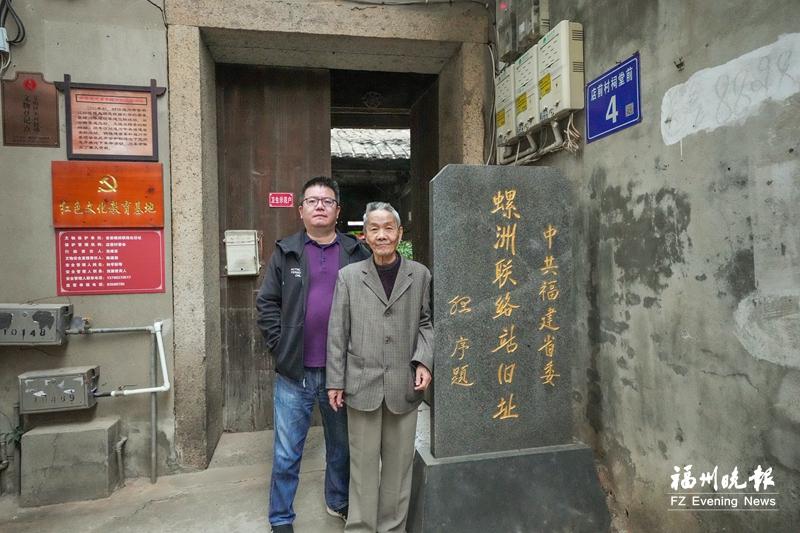 陈传谦父子在陈莲亭烈士故居宅门前合影。芦懿 摄