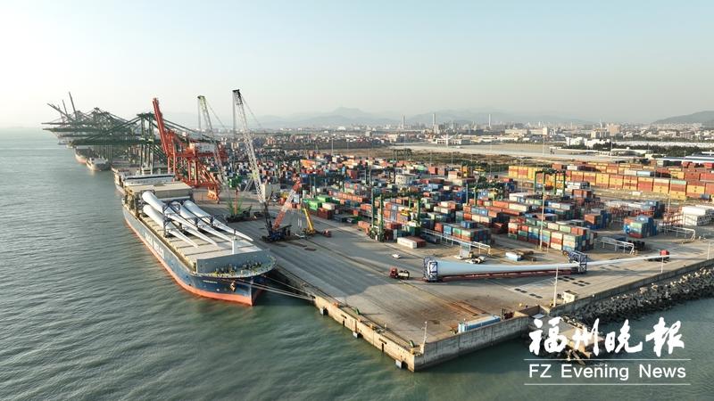 越来越多的“中国制造”“福州制造”正从江阴港区扬帆出海。26日,8片长达108米的风电叶片从福州港江阴港区搭乘“POSIDANA”轮启程前往欧洲,这是今年江阴港区出口的第十六批风电叶片。