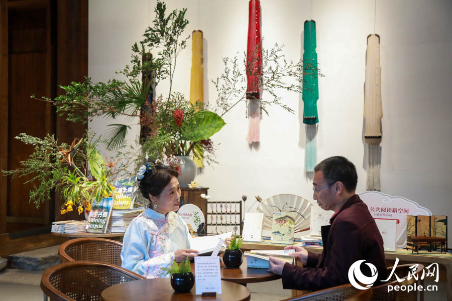 读者李女士在“八闽书房”公共阅读新空间交流。实习生 郑舒尘摄