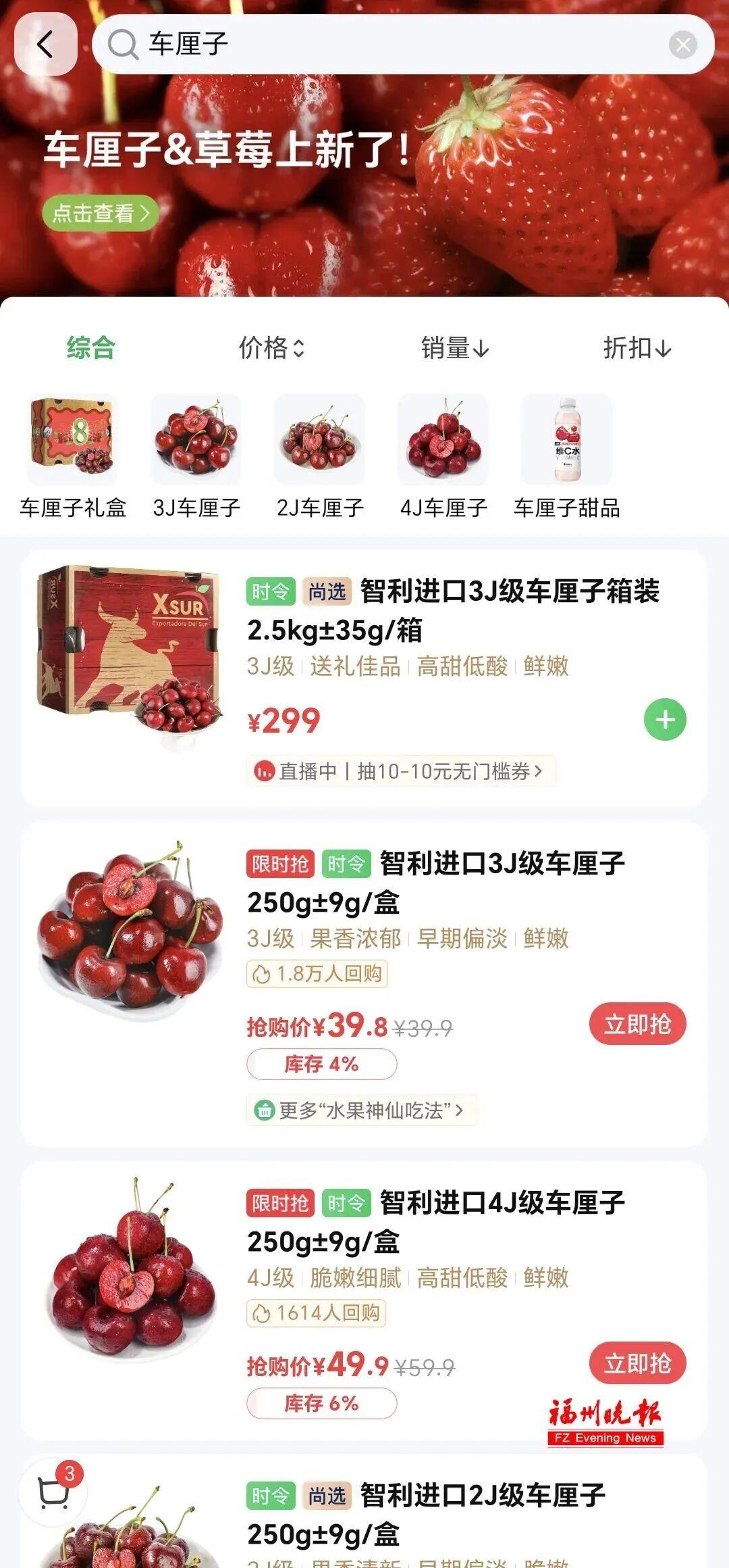 “JJJ级车厘子,一箱2.5公斤,价格299元。这比前段时间便宜多了。”4日上午,打开朴朴App,市民郭女士惊喜地发现,车厘子全面上新。不仅货源更新,大批智利进口3J和4J级车厘子出现在货架上,而且价格明显下降。原来价格为399元的2.5公斤装车厘子,价格直接下降了100元。
