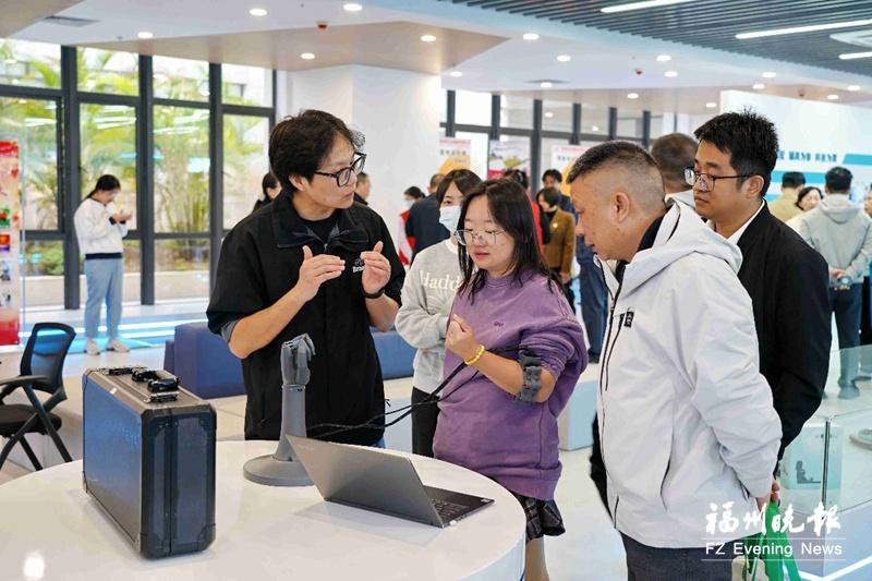 在辅具中心,工作人员向参观者介绍智能仿生手。