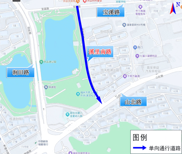 三、从2025年12月13日至施工结束(工期约100天),根据施工进展,视情对溪里南路(北起宝溪路口,南至山北路口)实行机动车由北往南单向通行。
