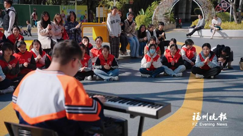 9时许,公园宣传长廊前响起庄严的国歌旋律,就读于福州第十中学的听障女孩刘子妍面向观众,以富有表现力的手语“唱”出国歌。琴声与手语交融的表演形式吸引了众多市民驻足,不少市民还现场跟随学习手语动作。“第一次这么近接触手语国歌,感觉很震撼,也体会到沟通可以有这么多方式。”市民陈女士说。随后,孤独症青年郑昱成用电子琴弹奏了《我和我的祖国》《孤勇者》等歌曲。在场市民与青年志愿者自发围坐,跟随节奏拍手互动。