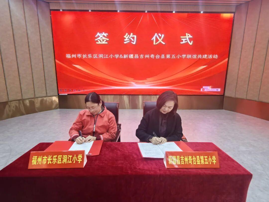 在奇台县第五小学结对共建学校——福州市长乐区洞江小学,两校领导围绕办学特色打造、教学质量提升、师资队伍建设等进行深度交流并达成合作意向,签署结对共建深化合作协议。