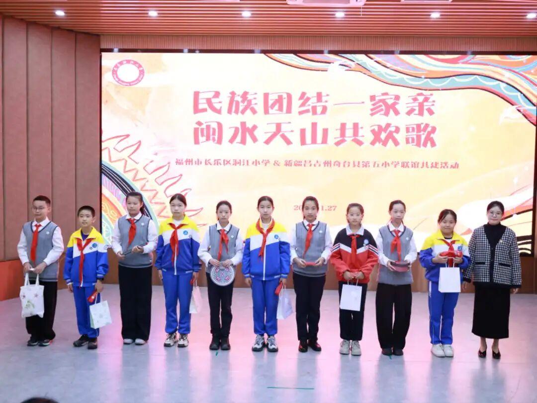 两校学子们互赠承载家乡特色礼物,奇台娃带来了维吾尔族小花帽、雕刻精美的哈萨克族刺绣挂件、囊饼小挎包,还有印着新疆山水的明信片等;洞江学子回赠了绘有闽江山水的油纸伞、福州线面、福橘与橄榄,以及蕴含海洋文化的贝壳手工艺品等。