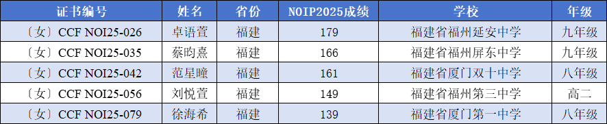 刚刚,NOI 女生竞赛获奖名单同步公示,福建共5人获得一等奖。