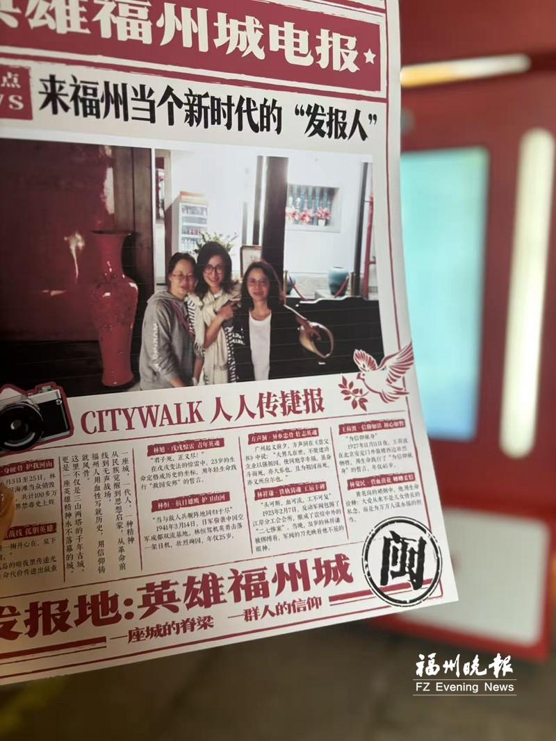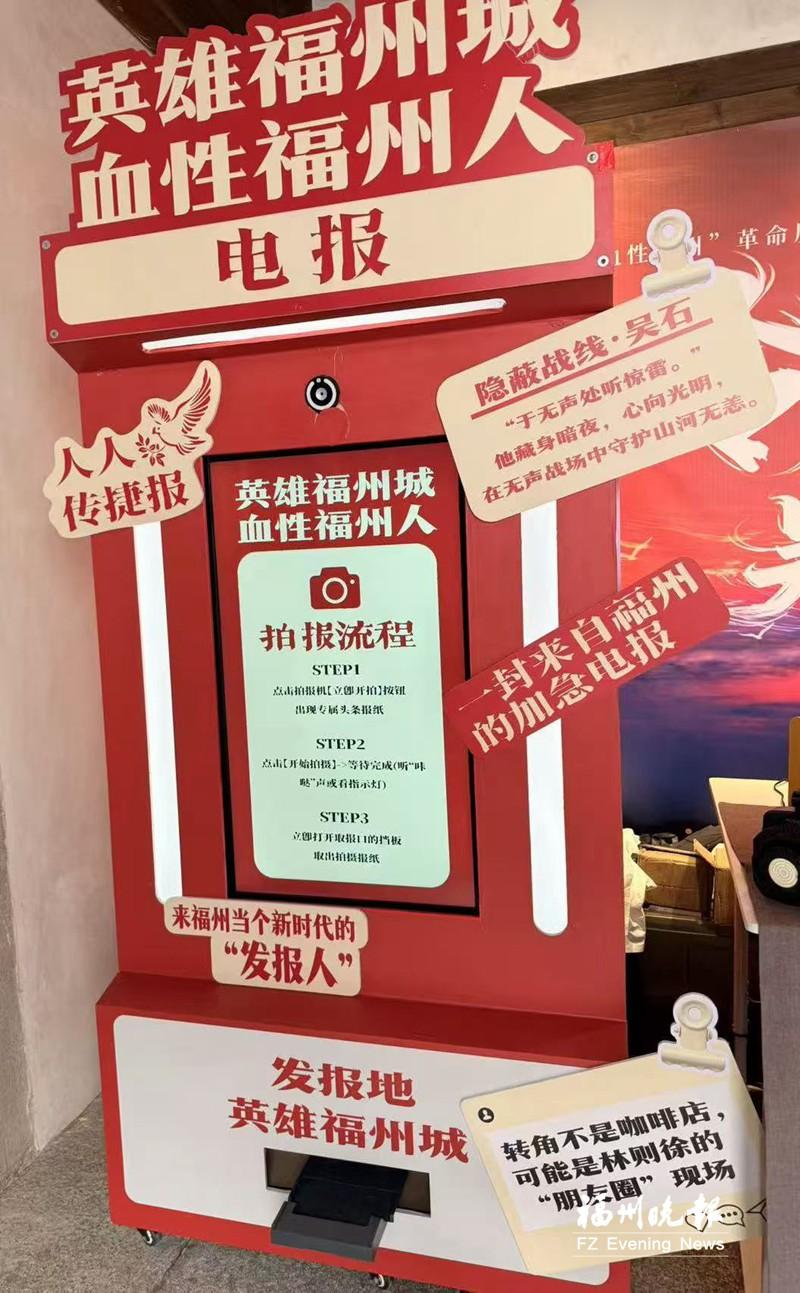 “没想到操作这么简单,三步就能拿到专属‘电报’!”带着孩子排队体验的厦门游客陈女士高兴地说。她按照装置旁的操作指南,指导孩子按下“立即开拍”按钮,见到屏幕上跳出“专属头条”字样后,再选择版式并点击“开始拍摄”,只见镜头将古厝门庭的古朴景致与孩子身影定格,取报口短短几秒后就输出了一份设计精美的专属“电报”。“电报”头条印着孩子的打卡照片,下面则详细介绍了从福州这座英雄城里走出的杰出代表,兼具纪念意义与科普价值。
