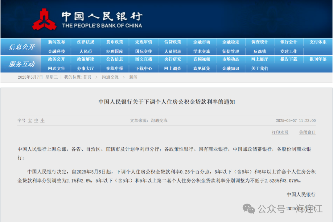 今年5月7日,中国人民银行发布通知,自2025年5月8日起,下调个人住房公积金贷款利率0.25个百分点,5年以下(含5年)和5年以上首套个人住房公积金贷款利率分别调整为2.1%和2.6%,5年以下(含5年)和5年以上第二套个人住房公积金贷款利率分别调整为不低于2.525%和3.075%。