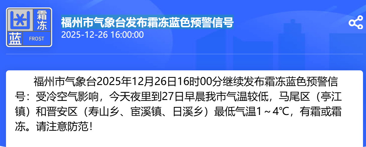 福州市气象台2025年12月26日16时00分继续发布霜冻蓝色预警信号:受冷空气影响,今天夜里到27日早晨我市气温较低,马尾区(亭江镇)和晋安区(寿山乡、宦溪镇、日溪乡)最低气温1~4℃,有霜或霜冻。请注意防范!