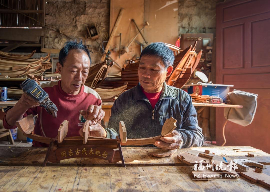 在千年渔村连江下屿村,81岁的郑树爱与67岁的郑树众、67岁的郑本意,多年来坚持制作福船模型,合力将这一非遗技艺传承下去。