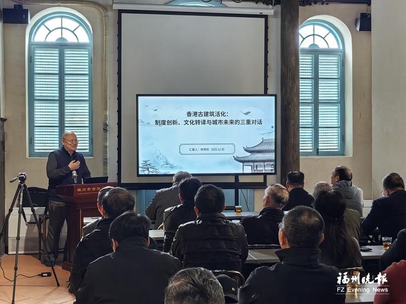 2025年12月31日上午,福州市古厝研究会举办的“古厝讲堂”迎来第八讲,香港知名学者和媒体人林贡钦带来的《香港古建筑活化:制度创新、文化转译与城市未来的三重对话》主题讲座内容丰富、深入浅出。40多位古厝研究会会员及古建筑爱好者参加了活动。