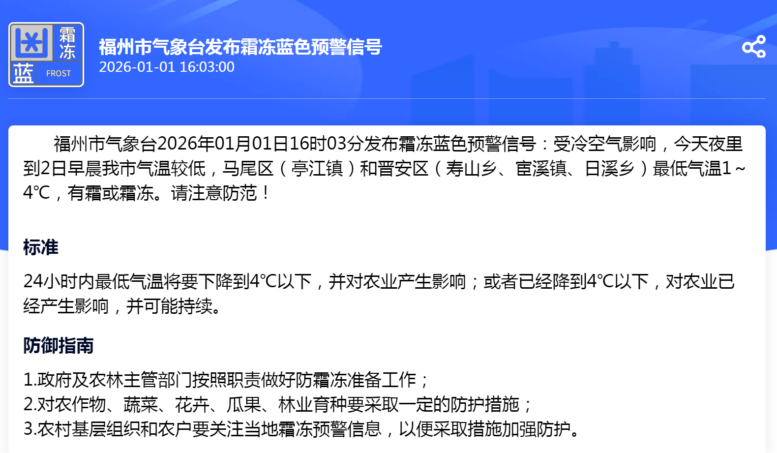 福州市气象台2026年01月01日16时03分发布霜冻蓝色预警信号:受冷空气影响,今天夜里到2日早晨我市气温较低,马尾区(亭江镇)和晋安区(寿山乡、宦溪镇、日溪乡)最低气温1~4℃,有霜或霜冻。请注意防范!