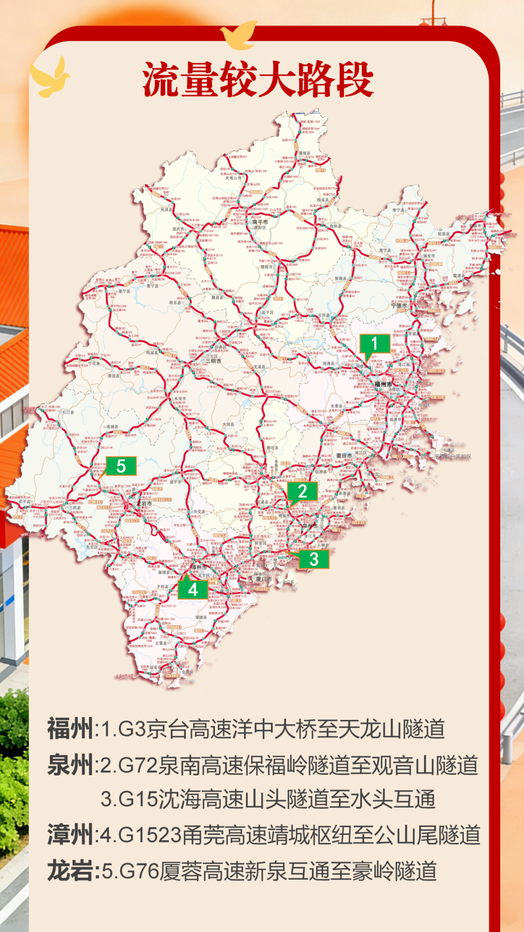 全省主要缓行路段分布:京台高速福州闽侯半山隧道至宁德古田排头枢纽路段、泉南高速泉州南安观音山隧道至保福岭隧道路段、沈海高速泉州南安水头路段、甬莞高速漳州南靖公山尾隧道至高梨山隧道路段、厦蓉高速龙岩上杭豪岭隧道路段。