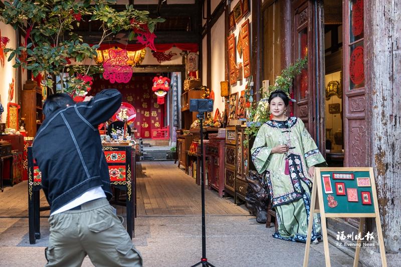 在三坊七巷古厝内,摄影师为头戴“三条簪”的游客拍照。 记者 林双伟 摄