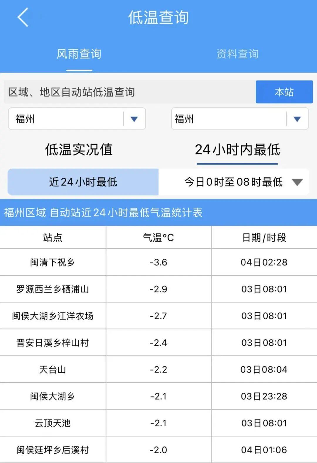 4日,福州多地最低温跌破0℃,其中,闽清下祝乡最低气温仅-3.6℃。