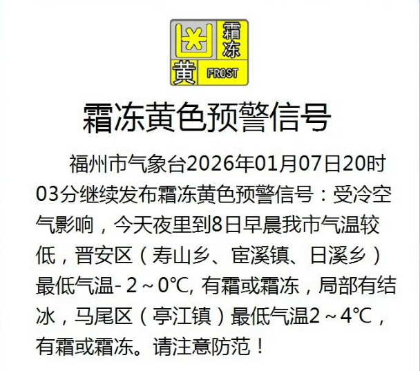 受冷空气影响,8日早晨我市气温较低,晋安区(寿山乡、宦溪镇、日溪乡)最低气温-2~0℃,有霜或霜冻,局部有结冰,马尾区(亭江镇)最低气温2~4℃,有霜或霜冻。