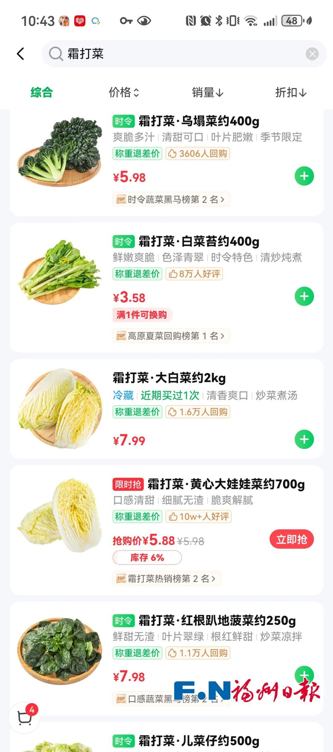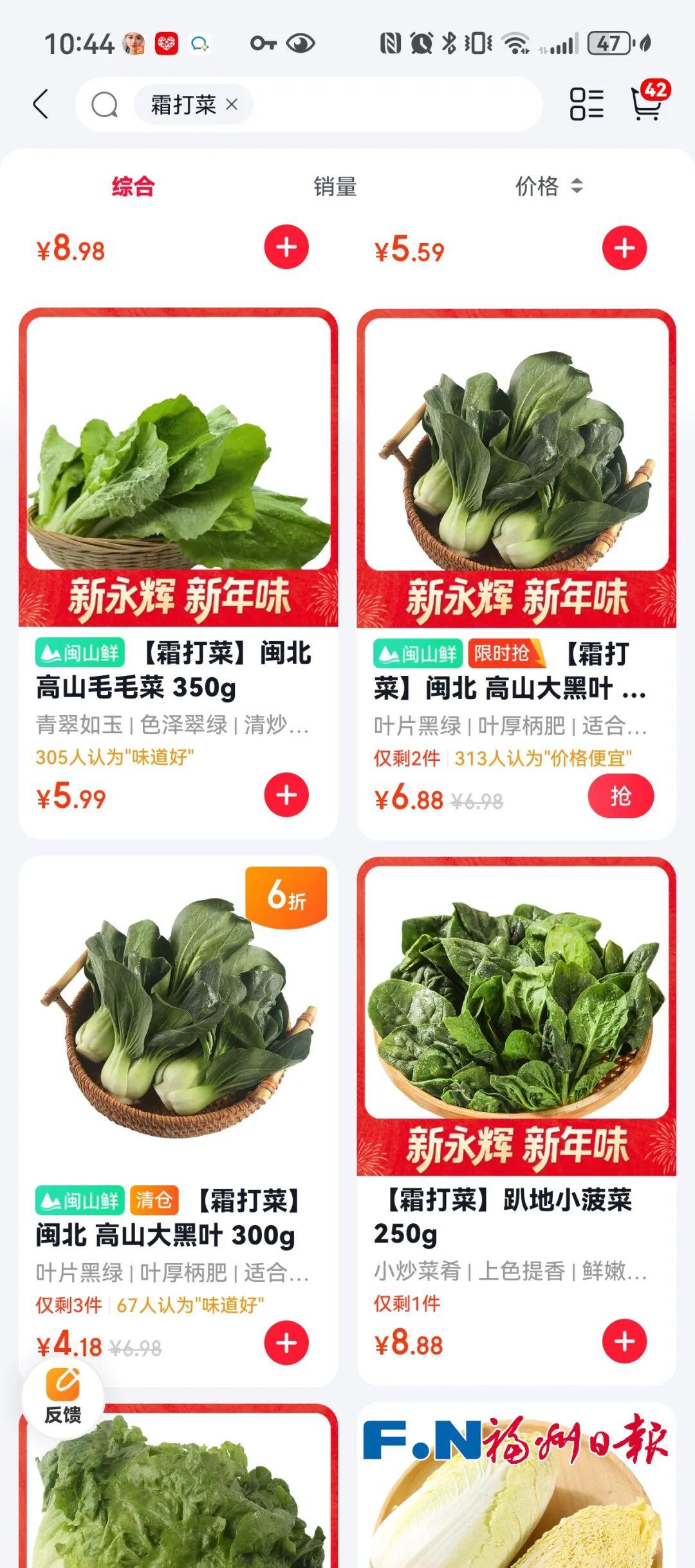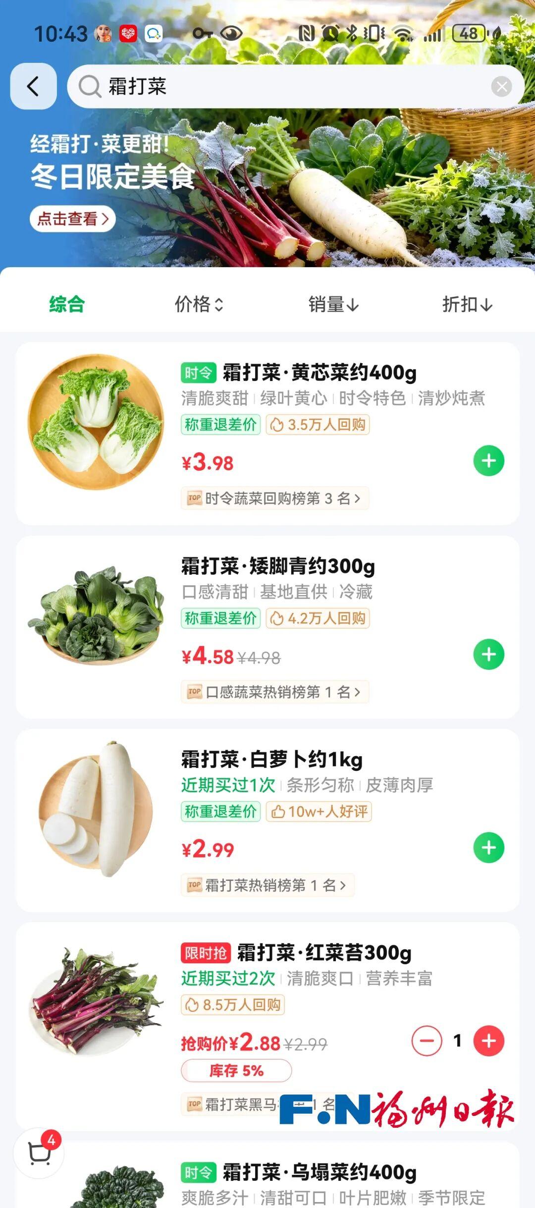 “霜打大白菜2元一斤,霜打菠菜5元一斤……”(换算单位说明:一斤=500g)9日,台江区一家早市销售菠菜、大白菜、钙菜、上海青、春菜等霜打菜的摊位前,围满了前来选购的市民。永辉、新华都等各大超市以及朴朴、永辉线上平台最近“霜打菜”也卖得特别火爆。据悉,“霜打菜”属于时令蔬菜,超市每年仅上架约3个月,以此保障食材品质。