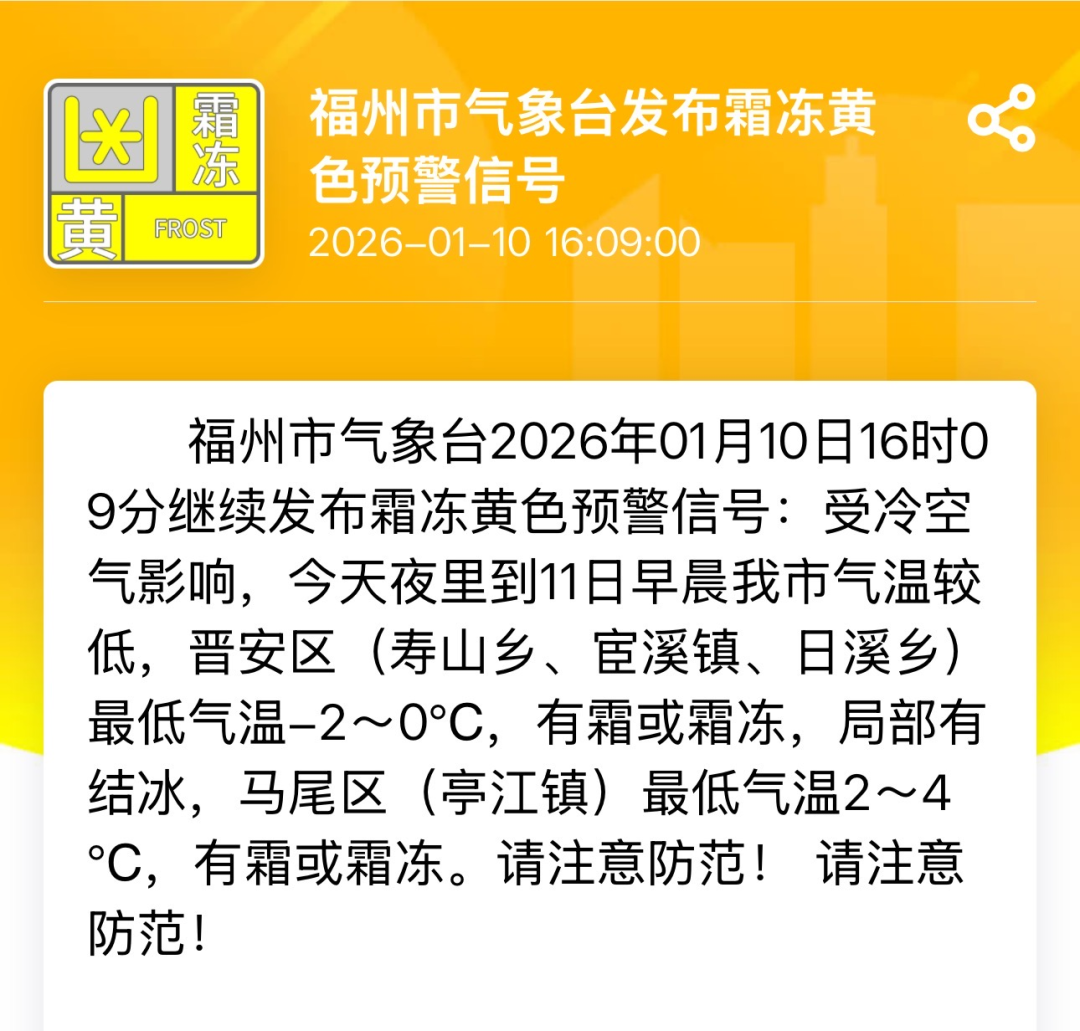 2026年1月10日16时09分,福州市气象台发布霜冻黄色预警信号。
