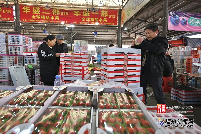 不远处,久泰果品商行的总经理郭忠顺正指挥工人装车交付又一批果品货物。“车厘子、草莓、砂糖橘——过年必备‘3件套’,销量一天比一天旺!”他笑着说,目前普通草莓批发价可低至每斤10几元,比往年便宜了好几块,砂糖橘也从每斤4元左右降到3元左右。