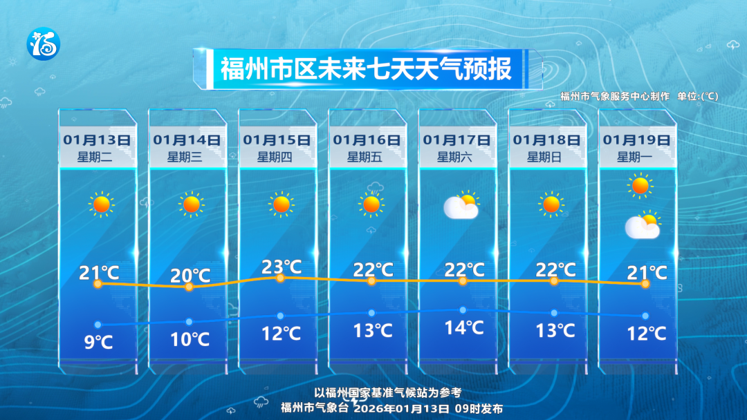 近期全国大部地区将掀起一波回暖浪潮!这波回暖,不止涉及范围广,而且升温力度大,持续时间也比较长。未来一周福州白天的最高气温基本稳定在20℃左右,天气也十分晴朗。