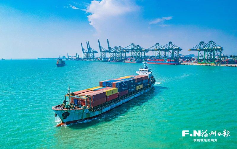 满载货物的集装箱货轮从福州江阴港集装箱码头起航。