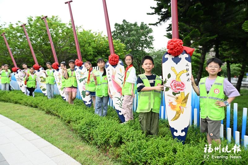 在福州龙舟主题公园内,福州晚报写作训练营的小营员与龙舟柳叶桨模型合影。资料图