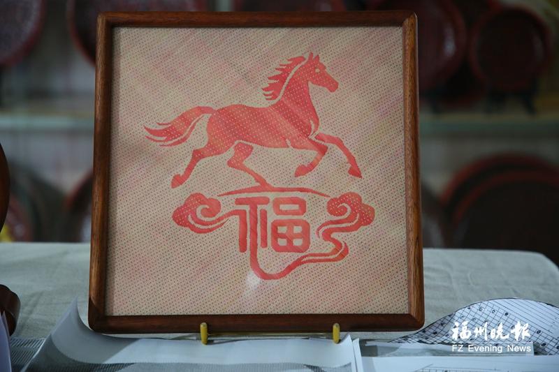 吴航喜箩制作基地内,技艺传承人李绍龙的马年新作上,骏马昂首扬蹄、马蹄下祥云缭绕、云中“福”字熠熠生辉,蕴含“马上有福”“马到成功”的吉祥寓意,烘托出厚重鲜活的非遗色彩。