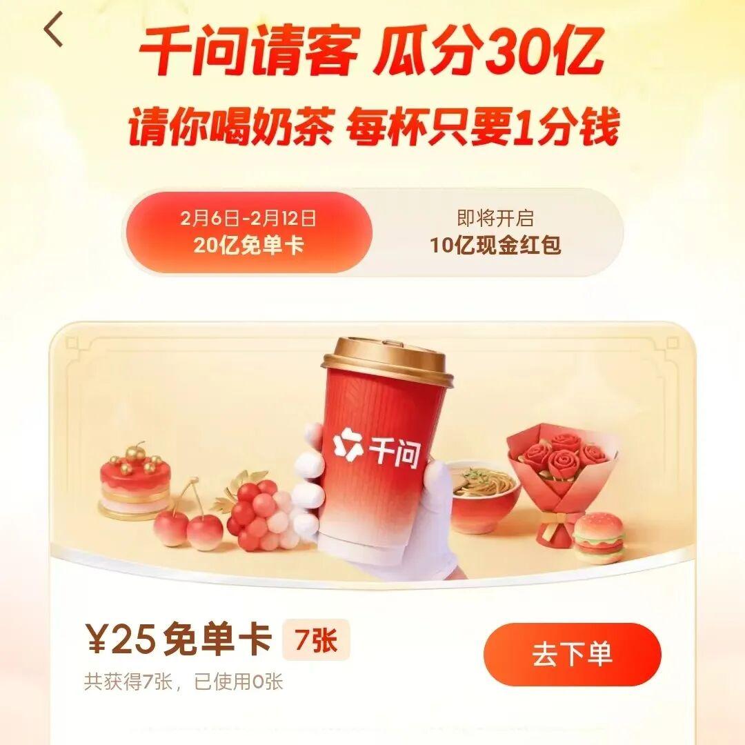 2月2日,阿里“千问”则宣布“春节请客计划”,发布大额红包,可通过千问订奶茶咖啡、电影票、飞机票、酒店、景点门票等,有请客免单等优惠活动。
