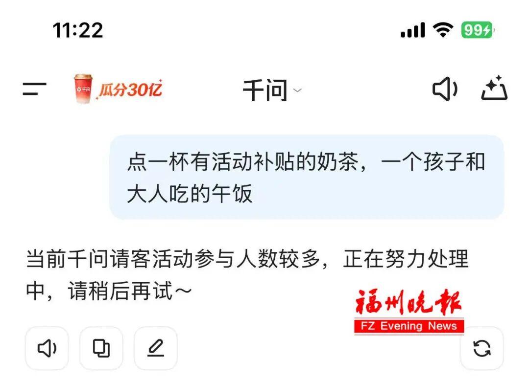 顾女士成功抢到免单奶茶,她的朋友赵女士却手慢了一步。虽然也抢到了红包,但在下单购物的时候,赵女士却得到“当前千问请客活动参与人数较多,正在努力处理中,请稍后再试~”的提示。