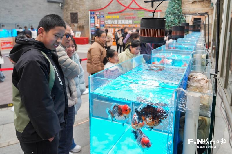“好多金鱼”“太可爱了”……在螺洲古镇游客服务中心的“古厝观鱼”展区,35口金鱼展示缸环形排列,福州多家养殖场选送的宽尾琉金、熏墨花兰寿、长尾玛丽狮等超30种福州传统、特色金鱼在缸里欢快地游弋。
