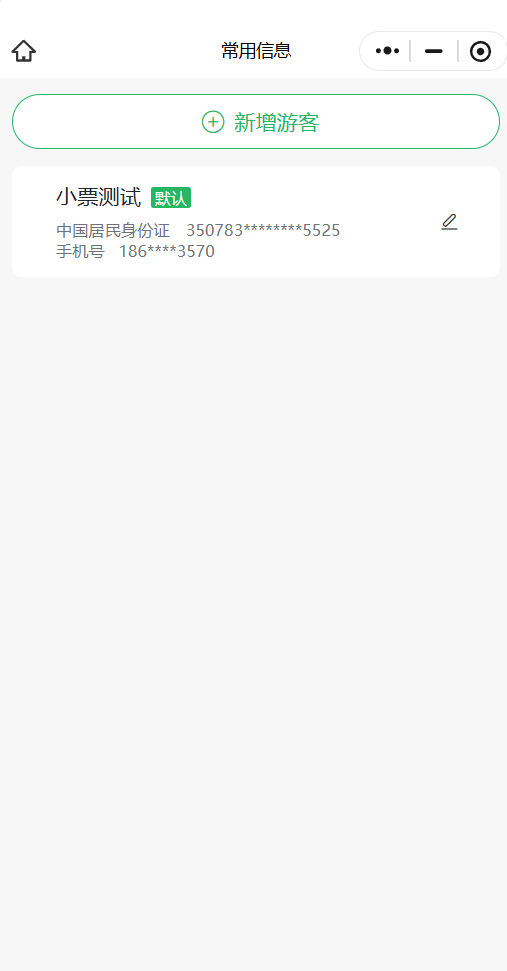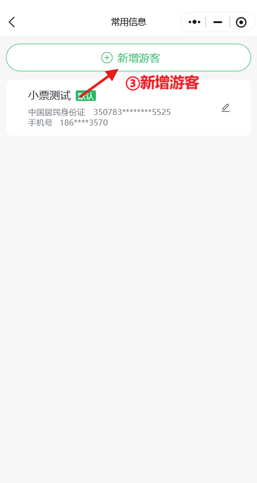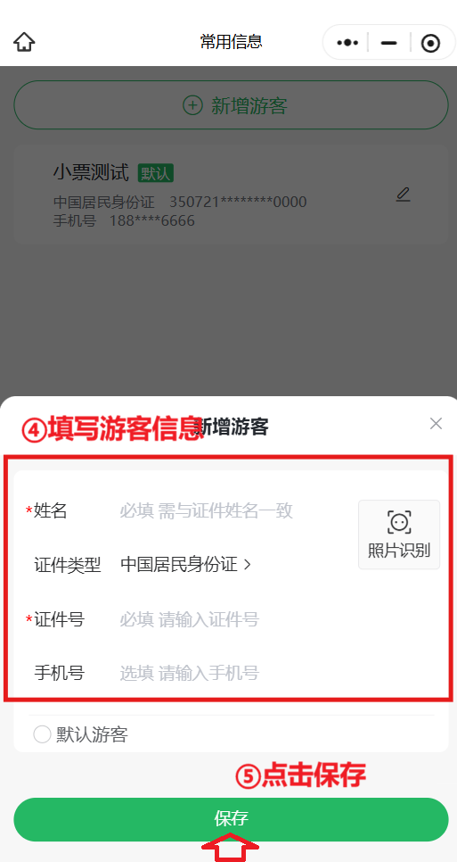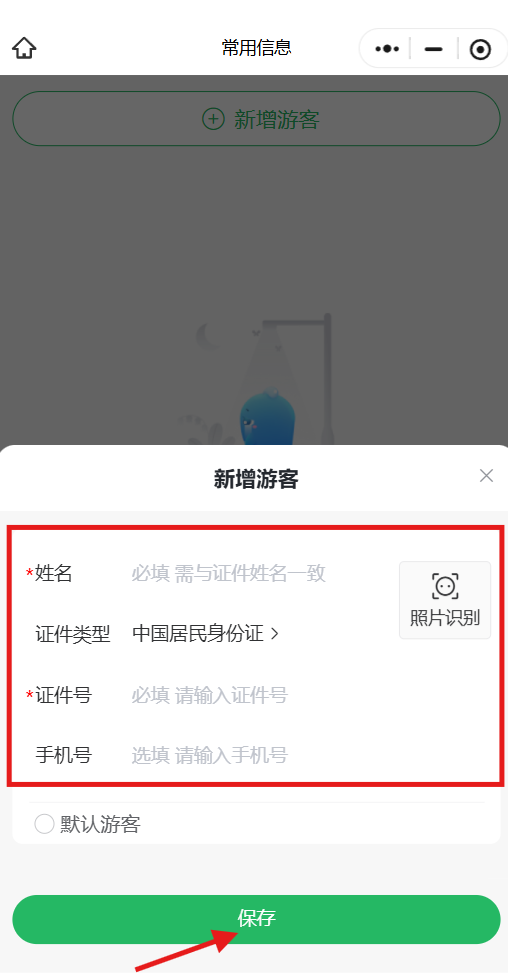填写游客姓名、证件号、手机号等信息,可在“我的—常用信息”中提前录入并保存。