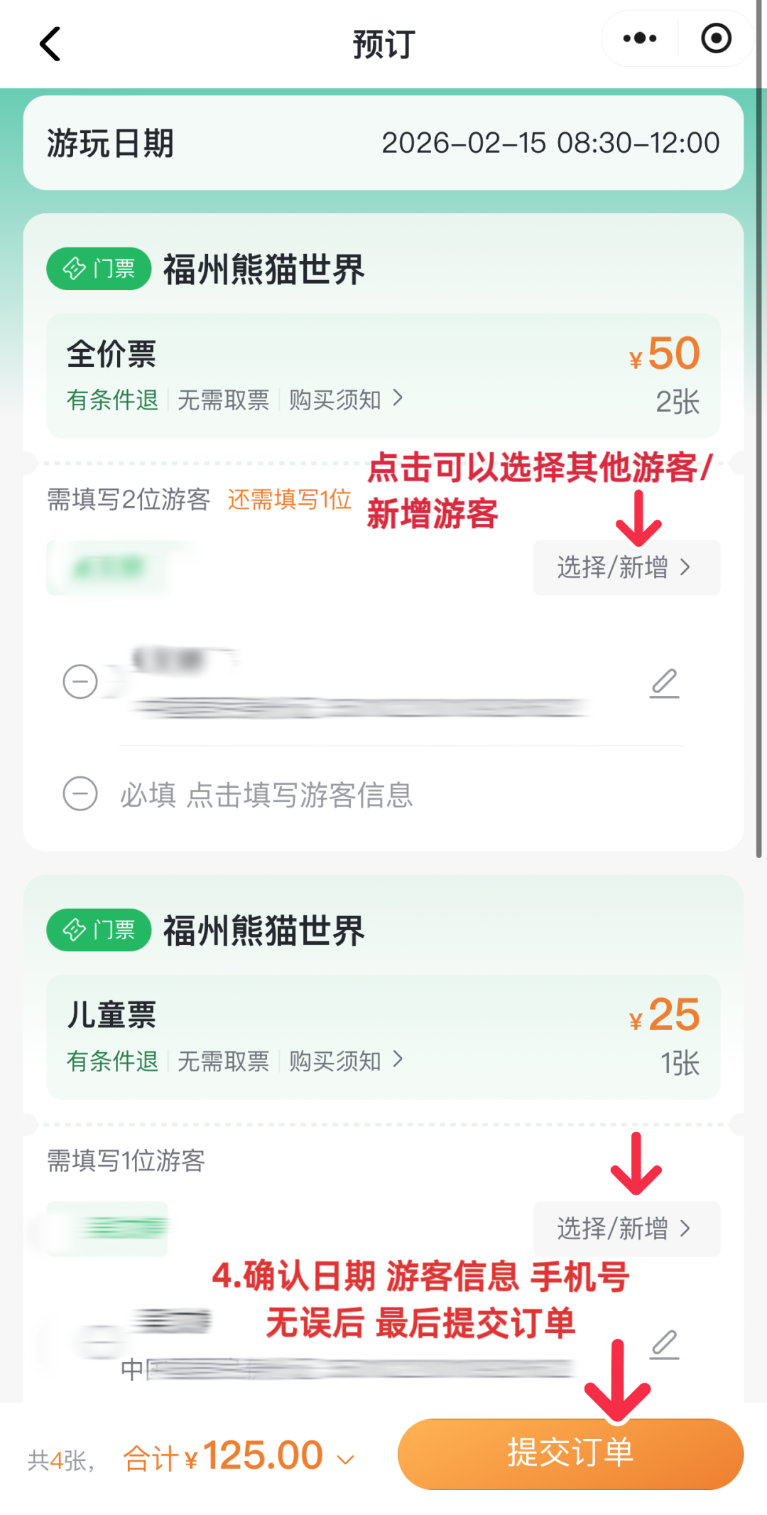 确认日期、游客信息和手机号无误后,点击“提交订单”。