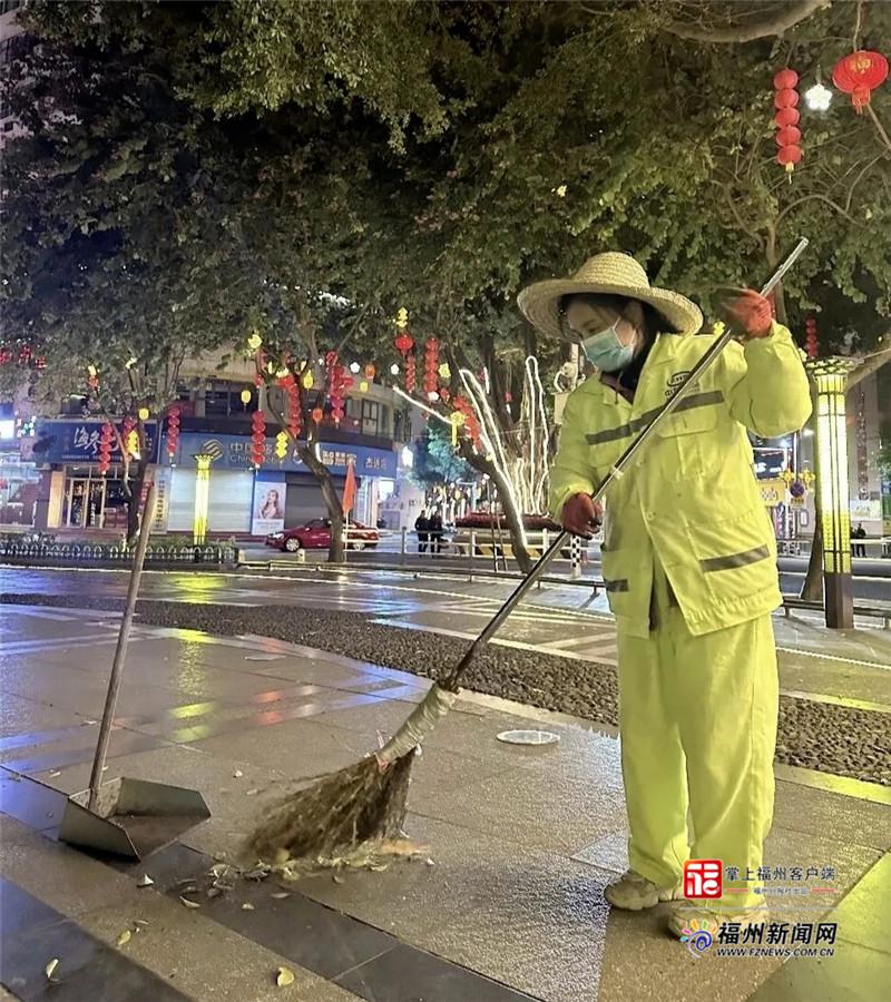 福州新闻网2月17日讯(记者 谭湘竹 文/摄)2月16日,除夕。夜幕降临,闽清县城华灯初上,万家团圆之时,解放大街、南北大街的路边却依然跃动着一抹抹醒目的“荧光绿”。当中航美丽闽清项目的环卫工人们手持扫帚与簸箕,穿梭在渐稀的车流与人流之间,一场守护城市颜值的“保洁战”才刚刚进入最紧张的阶段。