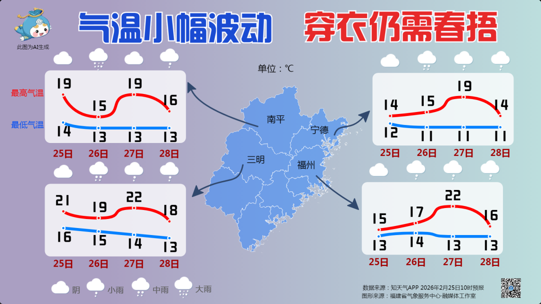 另据福建气象消息,25日白天全省大部雨水暂歇,以多云到阴的天气为主,有分散性小雨,夜里起中北部地区大部有小雨。