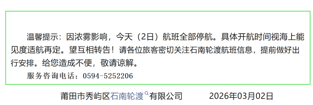 因浓雾影响,石南轮渡2日航班全部停航。具体开航时间视海上能见度适航再定。